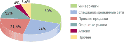 Рисунок 10. Удельный вес каналов дистрибуции на российском парфюмерно-косметическом рынке
