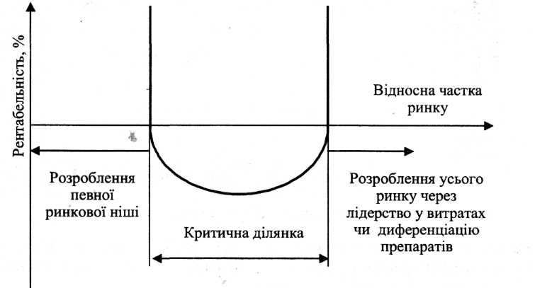 Загальна стратегічна модель Портера ґрунтується на положенні, що шанс досягнути необхідного рівня рентабельності мають як великі фармацевтичні підприємства із значною часткою ринку, так і невеликі спеціалізовані фірми. При цьому небезпечною є середня позиція, і тому підприємствам, які не мають засобів чи зусиль для досягнення лідерства на ринку, необхідно сконцентрувати свою роботу на певному сегменті і нарощувати там переваги стосовно конкурентів. Зв'язок між часткою ринку і рентабельністю, за Портером, показаний на рис. 3.