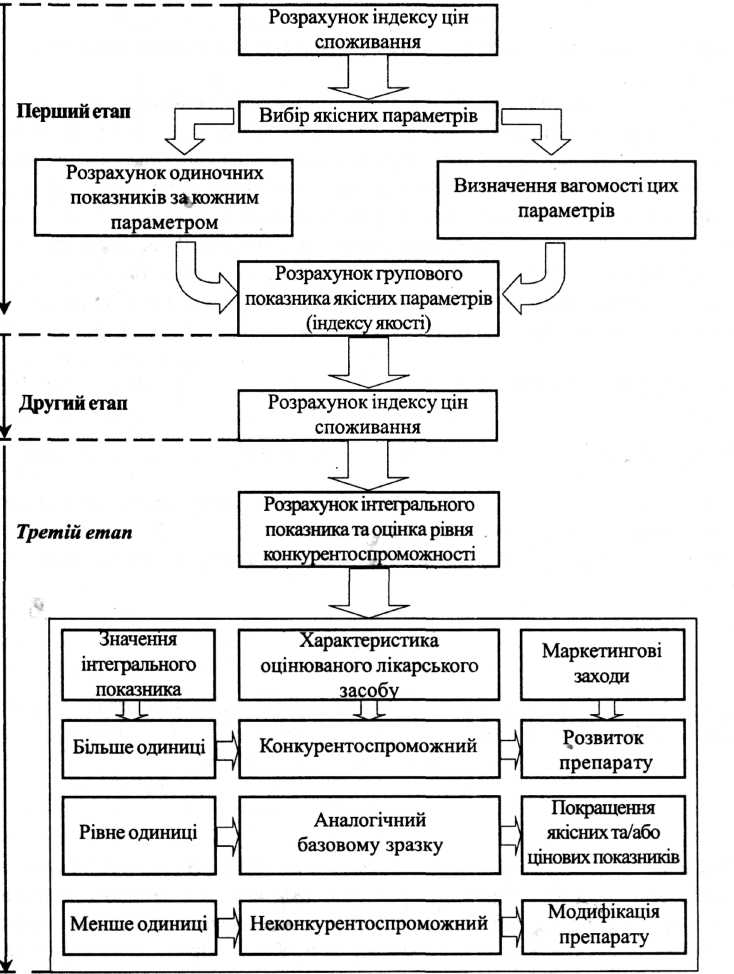 Одна з них - методика оцінки рівня якісно-цінової конкурентоспроможності. Як видно з даних рис.1, ця методика передбачає три етапи розрахунків. Перший етап визначення конкурентоспроможності досліджуваного лікарського засобу передбачає обрання серед ринкових аналогів базового варіанта, який найкраще задовольняє потребу споживачів і з котрим порівнюватимуть даний препарат. Потім здійснюється добір якісних (функціональних) параметрів. До них належить терапевтична ефективність, безпечність та переваги перед аналогами тощо.