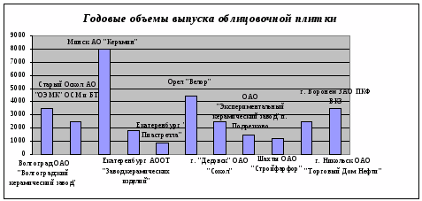 Как видно из диаграммы, ЗАО ПКФ ВКЗ занимает прочную среднюю позицию по годовому производству облицовочной плитки, и предполагаемое наращивание объемов выпуска до 5.6 млн. кв. м. в год, позволит при постоянно существующем дефиците продукции и соответствующей маркетинговой политике занять дополнительные доли рынка сбыта. Реальную конкуренцию смогут составить АО «Керамин», Беларусь, и АО «Велор», г. Орел.