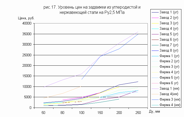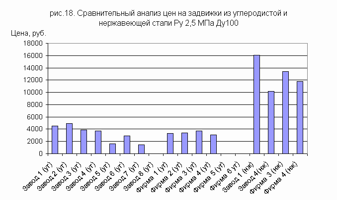 2.6 Анализ рынка задвижек из углеродистой и нержавеющей стали на PN25 Проведем сравнительный анализ заводов и фирм-изготовителей задвижек диаметра DN100 и давления PN25 и колебаний цен в зависимости от используемого материала.