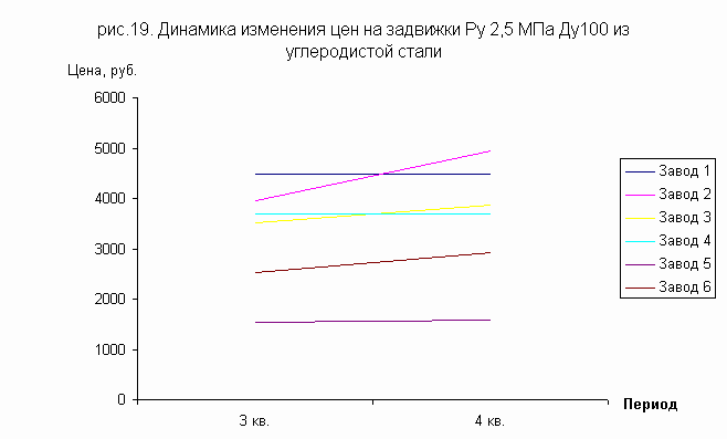 Динамика изменения цен на примере задвижки из углеродистой стали PN2,5 DN100, приведенная на графике (рис.24) демонстрирует три подхода к вопросу ценообразования на выбранных заводах. Заводы 1, 4 и 5 цену во втором полугодии не меняли, так как у одних цены и так довольно высокие, а другие выпускают штампосварные задвижки, пользующиеся меньшим спросом по сравнению с литыми. Заводы 3 и 6 плавно увеличивают цену пропорционально уровню инфляции. И только завод 2, руководствуясь только ему одному известными соображениями, повышает и без того высокую цену, выбиваясь в лидеры.