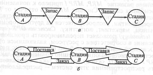 а — традиционный (отдельная стадия запасов); б— JIT -подход (поставка по требованию)