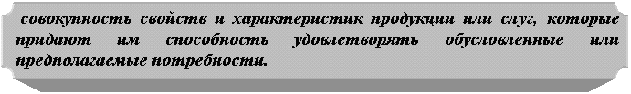 Таким образом, категория качества лежит в основе понятия конкурентоспособности. Если производитель намерен сделать свою продукцию конкурентоспособной, он должен определить условные характеристики прогнозируемой потребности возможно точнее.