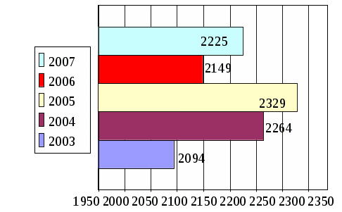 Рис. 2. Объёмы производства хлопчатобумажных тканей за 2003-2007 года в России, млн. м2