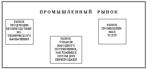 Промышленный рынок будем понимать как состоящий из рынка продукции промышленно-технического назначения (ППТН), рынка товаров народного потребления (ТНП), реализуемых оптом, и рынка промышленных услуг (рис.1.). Промышленный рынок охватывает весь комплекс взаимоотношений между хозяйствующими субъектами, осуществляемых в границах определенной местности или отрасли.