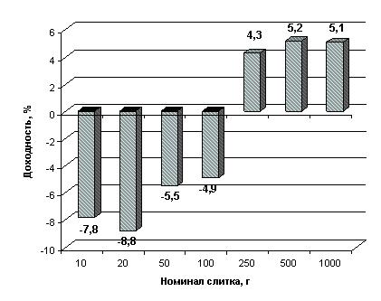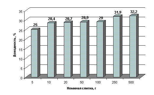 Доходность золотых слитков разных номиналов