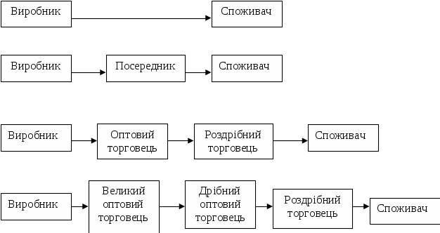 Рівень каналу розподілу – це будь-який посередник, що виконує певну роботу з просування товару і передачі права власності на нього кінцевому споживачеві. Оскільки певні функції розподілу виконують і сам виробник, і кінцевий споживач, вони також входять до складу будь-якого каналу. В цілому протяжність каналу залежить від кількості проміжних рівнів у ньому (рис. 1.2.).
