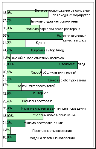 К наименее значимым факторам можно отнести <престижность заведения> (всего 14,9% экспертов посчитали его значимым), <размеры ресторана> (19,1% экспертов) и <контингент посетителей> (23,4% экспертов).