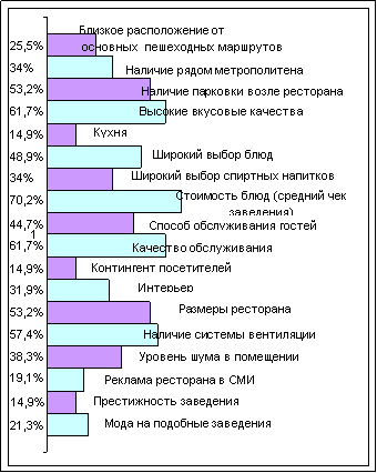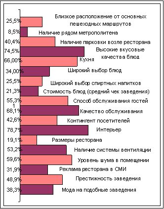 Для 76% опрошенных это – доступные цены, 71% - приятная атмосфера, 60% - хорошее обслуживание, 52% - качество и вкус продуктов, 40% - скидки, бонусы (немаловажный фактор), 37% - разнообразное меню, 32% - быстрота обслуживания, 30 % - интерьер, 21% - престиж ресторана и 21% - место расположения. Как мы видим, для многих главное – это приятная атмосфера и доступные цены.