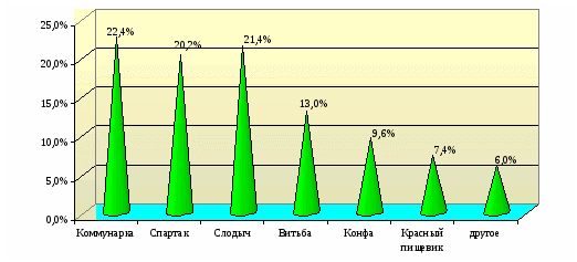 Что же касается удовлетворенности ассортиментом и вкусовыми качествами кондитерской продукции торговой марки "Коммунарка", то более половины всех опрошенных удовлетворены и ассортиментным рядом и качеством продукции данной торговой марки.