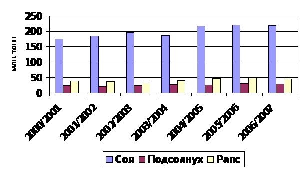 С целью определения возможностей получения сырья для производства биодизеля выполним анализ мировых тенденций производства масличных культур, в частности, сои, подсолнуха, рапса.