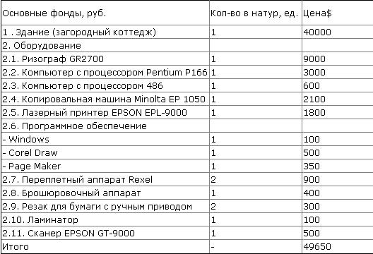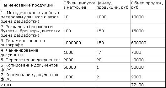 Предполагаемая деятельность фирмы имеет целью оказание услуг населению в области цветной полиграфии, а также сопутствующих услуг по переплету, сканированию, ламинированию, а также тиражированию печатных материалов как в небольших количествах, что можно сделать на копировальном аппарате, так и размножение таких материалов, тираж которых слишком велик для ксероксов и слишком мал для типографий при помощи ризографа. Фирма в состоянии обеспечить потребности в производстве бланков, формуляров, бюллетеней, листовок, рекламных брошюр, проспектов, буклетов. В рамках деятельности фирмы планируется привлечение заказов школ и вузов на изготовление методических и учебных материалов. Таким предполагается оказание услуг таким группам потребителей, как физические и юридические лица, удовлетворяя потребности в исполнении мелких заказов, а также и более крупных, для выполнения которых недостаточно обычного публикатора. Оборудование, имеющееся на балансе фирмы позволяет обеспечить низкую себестоимость изготавливаемой продукции, в том числе при больших тиражах, поскольку его функционирование характеризуется простотой обслуживания, отсутствием потребности в высококвалифицированном персонале, неприхотливостью, экологической чистотой.