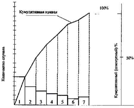 Диаграмма Парето - это особая форма вертикального столбикового графика, которая помогает определить, какие имеются проблемы, и выбрать порядок их решения. Построение диаграммы Парето, основанное или на контрольных листках или на других формах сбора данных помогает привлечь внимание и усилия к действительно важным проблемам. Можно достичь большего, занимаясь самым высоким столбиком, не уделяя внимания меньшим столбикам (рис. 5).