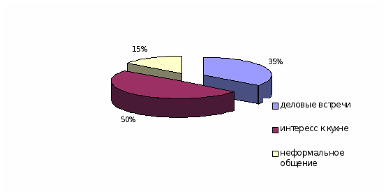 Значимой причиной посещения заведения является заинтересованность гостей в европейской кухне и широким ассортиментом кофе. Основную часть клиентов составляют гости, которые приходят не только вкусно поесть, но и провести деловые встречи. Предприятие также организует и проводит корпоративные вечеринки, разнообразные виды банкетов. Результаты сегментации поводов посещения кофейни отражены на диаграмме рис.2.
