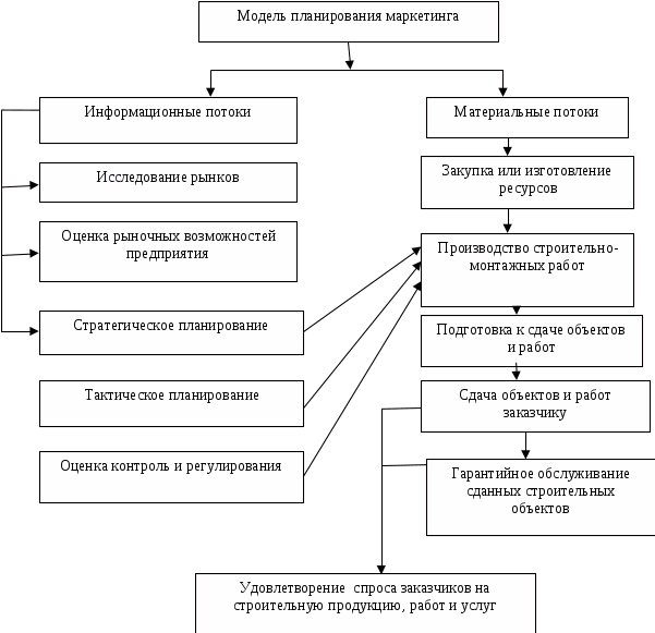 Планирование маркетинговой предприятие деятельности строительного предприятия осуществляется в определенной последовательности. Сначала устанавливают цели маркетинговой деятельности для отдельных проектов, строительных комплексов, объектов жилищного, социального или культурного назначения, а также видов работ и услуг. Затем разрабатывают альтернативные стратегии - строительство объектов улучшенной планировки, применение новой технологии и организации строительства, формирование рынка (продажа или сдача объектов заказчику), проникновение на новые рынки в другие регионы; выбирают наилучшую стратегию; формируют план маркетинговой деятельности, элементами которого являются строительные объекты, виды строительных и монтажных работ; цена (сметная стоимость) объектов и видов работ; пути реализации объектов и строительных и монтажных работ; сдача объектов и работ заказчику. Наряду с этим осуществляют календарное планирование, строительство объектов и выполнение работ, которые должны ответить на вопросы: кто является заказчиком и кто будет строить? что, когда, где, как и за счет каких ресурсов будет строиться?; разрабатывают бюджет маркетинга.