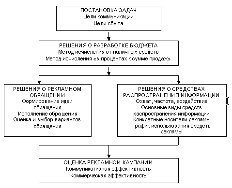 Решения относительно рекламного обращения предполагают формирование идеи этого обращения, оценку и выбор вариантов обращения и его эффектное исполнение. Решения о средствах распространения информации предполагают установление широты охвата, частоты появления и силы воздействия рекламы; отбор основных видов средств распространения информации; выбор конкретных носителей рекламы и разработку графика использования средств рекламы. И, наконец, оценка результатов рекламной кампании предполагает замеры коммуникативной и торговой эффективности рекламы до, в ходе и после этой кампании.