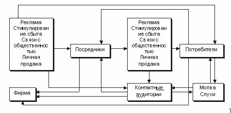 Современная туристская фирма управляет сложной системой маркетинговых коммуникаций (рис. 1). Сама она поддерживает коммуникации со своими посредниками, потребителями и различными контактными аудиториями. Ее посредники поддерживают коммуникации со всеми потребителями и различными контактными аудиториями. Потребители общаются друг с другом и другими контактными аудиториями. И одновременно каждая группа поддерживает коммуникационную обратную связь со всеми остальными.