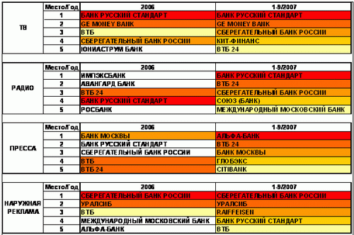 Банки-лидеры по рекламным затратам и банки, не вошедшие в двадцатку крупнейших рекламодателей, рекламируются по-разному. Лидеры тратят основные деньги на ТВ и прессу, а остальные банки больше предпочитают прессу и наружную рекламу. Радио и теми и другими используется мало, и в основном как вспомогательный рекламный носитель.