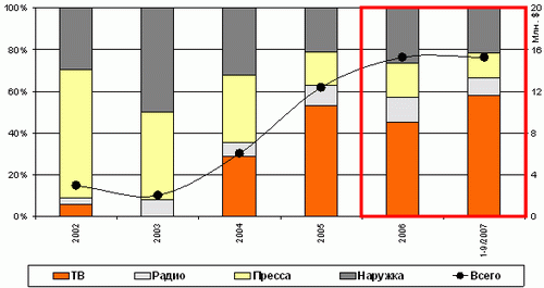 Основу рекламной активности составляет реклама на ТВ из-за наибольшего охвата этого медиа. Возможно именно поэтому, по оценке BAAR-индекса (это потребительский рейтинг наиболее прокатываемых рекламных ТВ-роликов. Респонденты (мужчины и женщины 25–45 лет со средним доходом) оценивают ролики по трем параметрам: «эстетическое восприятие» (нравится или не нравится то, что вы видите на экране), «доверие к продукту, марке, которые рекламируются», «самоидентификация» (насколько то, что вы видите на экране, для вас, про вас, насколько герои рекламы похожи на ваших знакомых и друзей).5