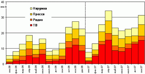 На ТВ-рекламе наиболее заметна сезонность – чередование всплесков и спадов затрат.