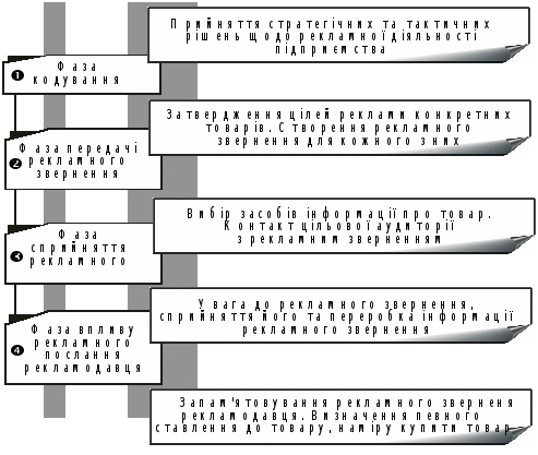 У період другої фази процесу рекламної комунікації відбувається передача рекламного звернення носів реклами, який має поширення та відомість серед цільової аудиторії виробника та його товару [20].