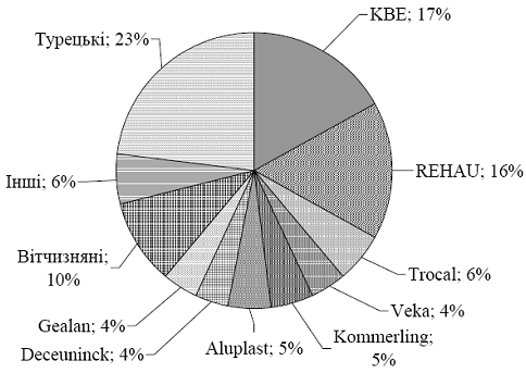 Висока увага до надійності комплектуючих спричинила ситуацію абсо-лютного домінування західноєвропейських торгових марок на ринку ПВХ-профілів (частка ринку 65-75%). На сьогодні в Україні їх представлено більше 20. Лідерські позиції займають німецькі фірми. Українські виробники (3 під-приємства), за оцінками експертів, забезпечують не більше 10% пропозиції.