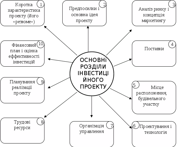 Відповідно до рекомендацій ЮНIДО (Організація Об'єднаних Націй по Промисловому Розвитку) інвестиційний проект повинний містити наступні основні розділи, представлені на рисунку 1.3.