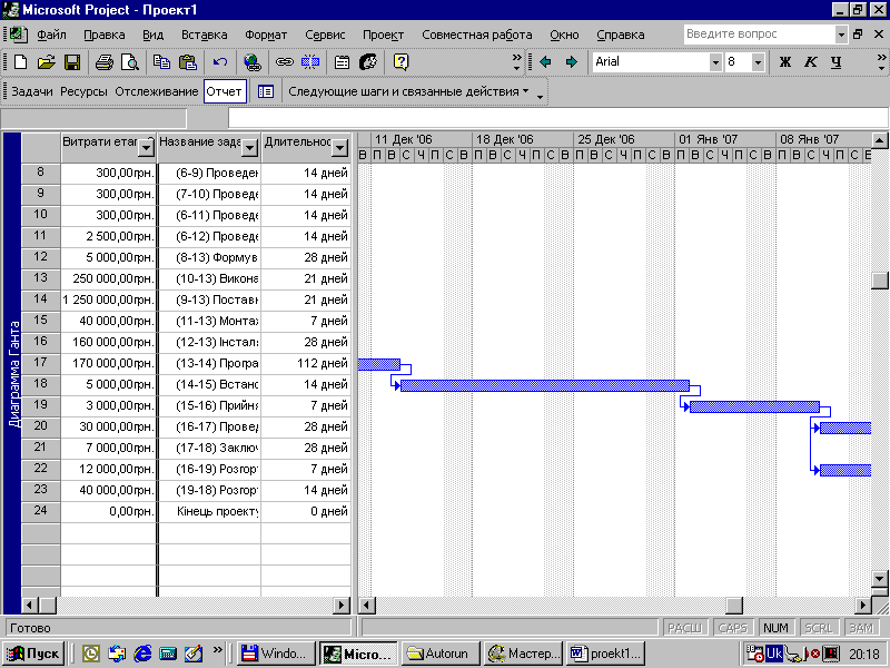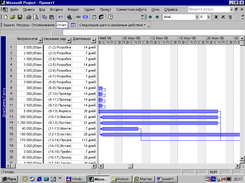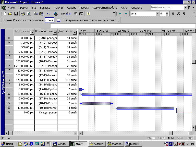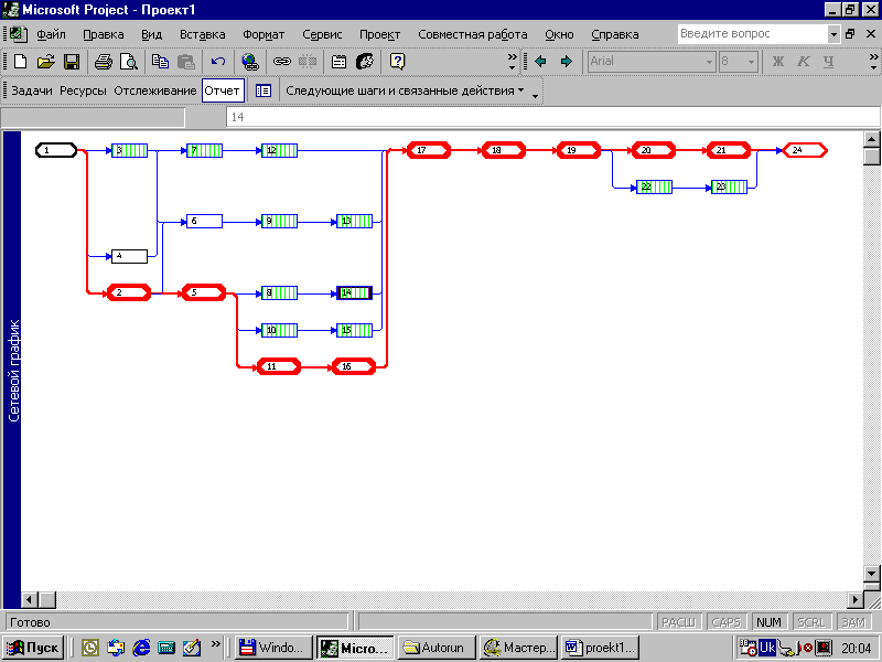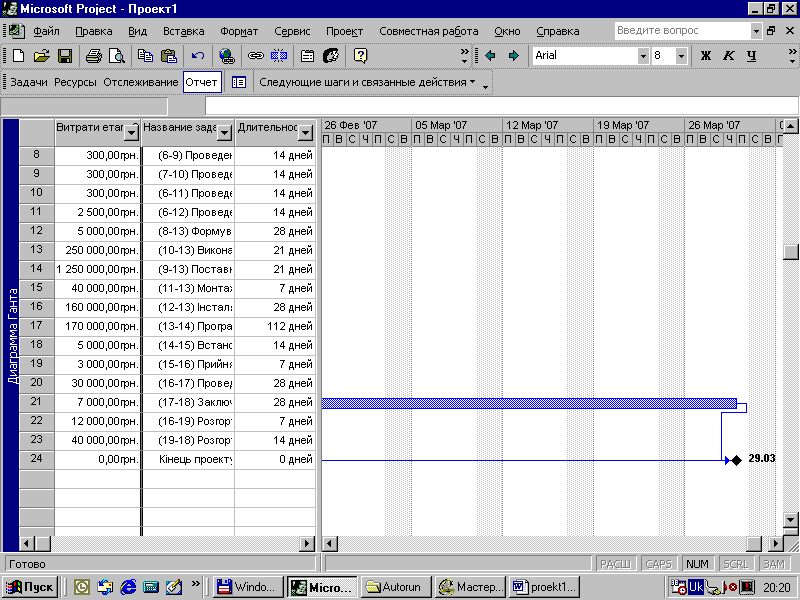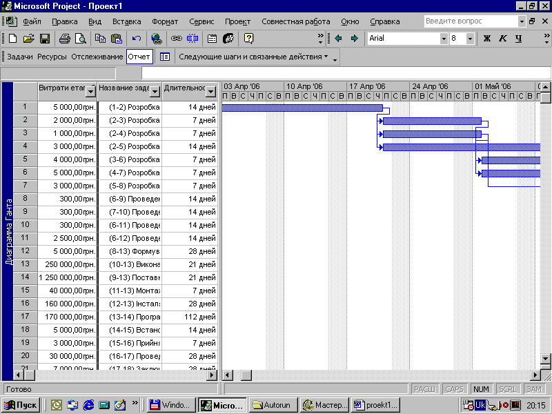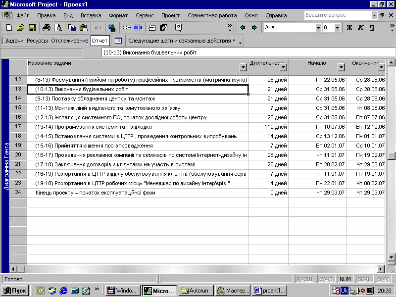 Рис. З.5 Побудова мережевого графіку виконання робіт в пакеті Microsoft Project-2002 (фрагмент 1)