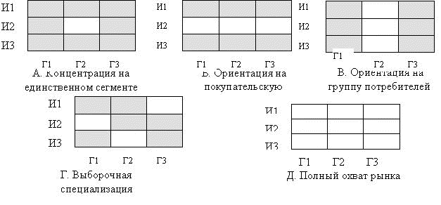 - сегментация – ориентация деятельности фирмы не на весь рынок в целом (один товар на всех потребителей), а на отдельные группы потребителей, целевые сегменты, предлагая каждому сегменту товар со своими характеристиками, качеством, ценами.