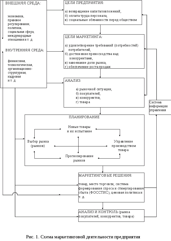 Маркетинг, как порождение рыночной экономики, является в определенном смысле философией производства, полностью (от научно-исследовательских и проектно-конструкторских работ до сбыта и сервиса) подчиненной условиям и требованиям рынка, находящимся в постоянном динамическом развитии под воздействием широкого спектра экономических, политических, научно-технических и социальных факторов. Предприятия-производители и экспортеры рассматривают маркетинг как средство для достижения целей, фиксированных на данный период по каждому конкретному рынку и его сегментам, с наивысшей экономической эффективностью. Однако это становится реальным тогда, когда производитель располагает возможностью систематически корректировать свои научно-технические, производственные и сбытовые планы в соответствии с изменениями рыночной конъюнктуры, маневрировать собственными материальными и интеллектуальными ресурсами, чтобы обеспечить необходимую гибкость в решении стратегических и тактических задач, исходя из результатов маркетинговых исследований. При этих условиях маркетинг становится фундаментом для долгосрочного и оперативного планирования производственно-коммерческой деятельности предприятия, составления экспортных программ производства, организации научно-технической, технологической, инвестиционной и производственно-сбытовой работы коллектива предприятия, а управление маркетингом - важнейшим элементом системы управления предприятием.