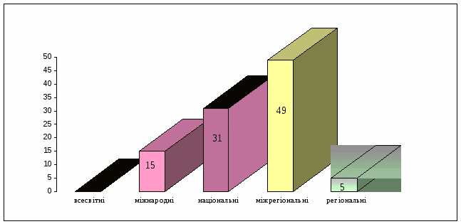 Рис. 4. Розподіл виставкових заходів, проведених у 2008 році, за статусом у % (див. Додатки)