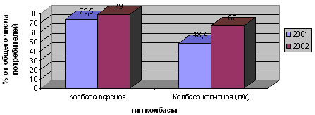 Изменились ли за исследуемый период, а он равен одному году, приоритеты покупателей относительно тех фирм - производителей, которые представлены на рынке. Можно констатировать тот факт, что на рынке поменялся лидер. В течение длительного времени это место занимал старейший производитель города Новосибирский мясоконсервный комбинат. Данные октябрьских исследований 2002 г. показали, что по такому показателю, как приверженность покупателей, лучшие позиции в городе занимает один из молодых мясоперерабатывающих заводов - компания "Торговая площадь". На Рис.2 представлены данные по приверженности покупателей 2001-2002 гг.