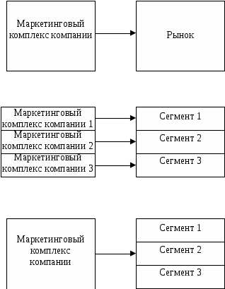 Фирма может воспользоваться тремя стратегиями охвата рынка: недифференцированный маркетинг, дифференцированный маркетинг и концентрированный маркетинг. Эти три подхода проиллюстрированы на следующем рисунке.