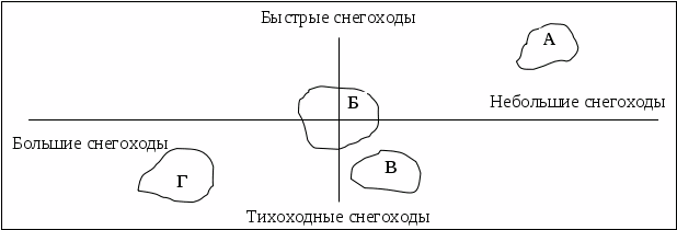 Конкурента "А" считают производителем маленьких быстроходных снегоходов, конкурента "Б" — производителем снегоходов средних размеров и средних скоростных показателей, конкурента "В" — производителем тихоходных снегоходов малых и средних размеров и конкурента "Г" — производителем больших тихоходных снегоходов. Площади кружков на схеме пропорциональны объемам продаж каждого из этих конкурентов.