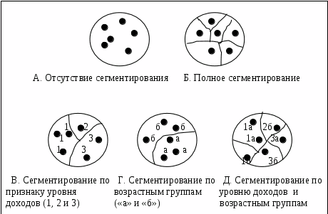 Многие производители не видят смысла в приспособлении своих товаров для удовлетворения нужд каждого конкретного покупателя. Вместо, этого продавец выявляет широкие разряды покупателей, отличающихся друг от друга своими требованиями к товару и/или своими ответными маркетинговыми реакциями. Например, продавец может обнаружить, что потребности меняются в зависимости от уровня доходов покупателей. Под пунктом (В) принадлежность каждого покупателя к той или иной группе по уровню доходов обозначена соответствующим номером (1, 2 и 3). Покупатели, относящиеся к одному и тому же классу по уровню доходов, отделены от остальных линией. При сегментировании по уровню доходов получается три сегмента, причем сегмент покупателей класса 1 оказывается самым многочисленным.