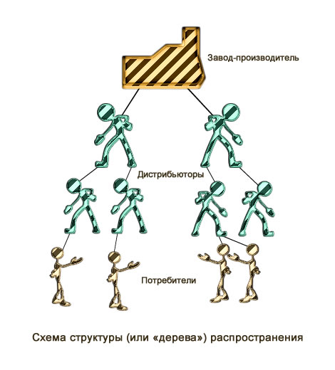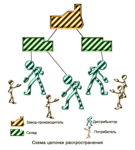 Сразу заметим – в настоящее время классическое сетевое распространение товара не используется. Действительно, товар может продаваться прямо со склада, и товар может переходить из рук в руки несколько раз, пока достигнет конечного потребителя (т.е. того человека, который съест БАД или накрасится косметикой).