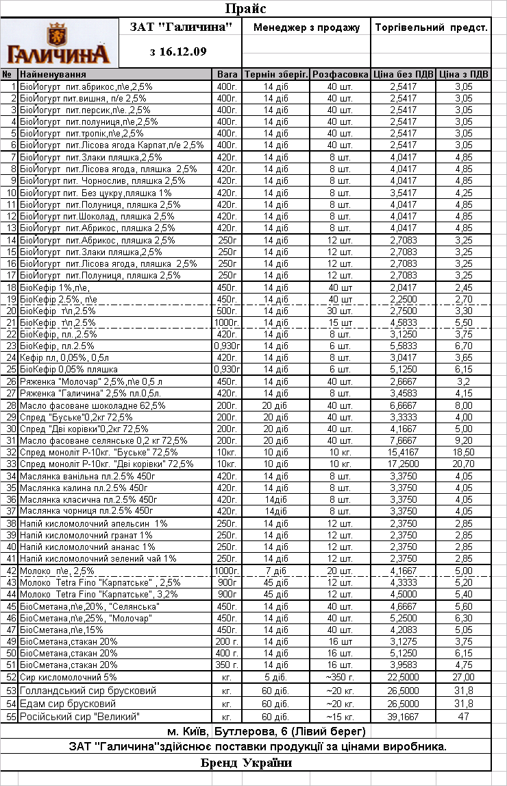3. Товарним асортиментом молочної продукції ЗАТ „Галичина”;