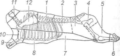 11 — заріз (III сорт); 12 — лопаткова частина (II сорт)