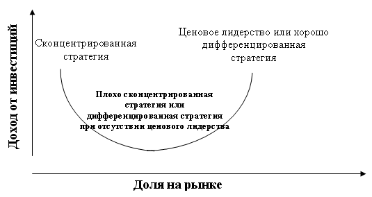Согласно модели Портера, зависимость между долей рынка и прибыльностью носит U-образную форму. Фирма с небольшой долей рынка может преуспеть благодаря стратегии концентрации. Компания, имеющая большую долю рынка, может преуспеть в силу преимущества по издержкам или дифференцированной стратегии. Но компания может «завязнуть в середине» и стать убыточной.