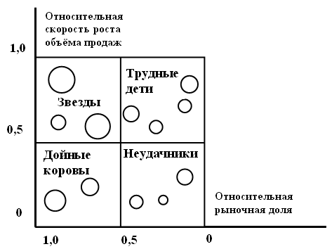 Существует несколько подходов, позволяющих оценить стратегию развития фирмы. Для анализа работы СХП организации наиболее эффективен подход, основанный на использовании матрицы «рост сбыта - доля рынка», которая разработана Бостонской консультационной группой. В ней для определения перспектив развития СХП используется такой показатель, как рост объема спроса, а для оценки масштабов СХП - его доля на рынке. Матрица предлагает следующую классификацию товаров, заказов и, соответственно, типов СХП - «звезды», «дойные коровы», «дикие кошки» и «собаки», и предполагает соответствующие стратегии для каждого из них.