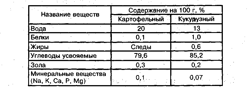 Крахмал представляет собой сыпучий порошок белого или слегка желтоватого цвета. Энергетическая ценность 100 г крахмала (в ккал/кДж): картофельного - 299/1251; кукурузного - 329/1377 Крахмал хорошо усваивается организмом.