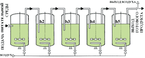 Исследованиями Ю.Л. Игнатова было показано, что накапливаемая в процессе уксусная кислота снижает окислительную активность бактерий и уменьшает удельную скорость роста клеток. Этот факт позволил П.И. Николаеву с сотрудниками организовать процесс получения уксусной кислоты в батарее из нескольких аппаратов глубинным способом в непрерывном режиме. В результате получилась оригинальная технологическая схема, в которой процесс получения 9%-ной уксусной кислоты ведут в четырёх-пяти последовательно соединённых ферментёрах (рис. 1)