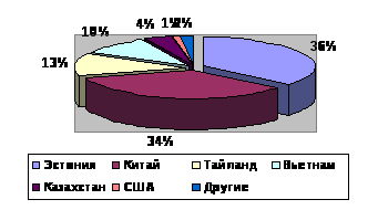 Отрасль готовой к употреблению рыбной продукции сегодня можно с определенностью назвать конкурентной и развивающейся. В 2008 году /12/ объем произведенной российским предприятиями готовой к употреблению рыбной продукции составил 272,4 тысячи тонн, причем 35% пришлось на кулинарные изделия. Так же растет импорт рыбы и рыбной продукции, что связано с изменением предпочтений потребителей в сторону более дорогой продукции. Крупнейшими импортерами сушеной, соленой и копченой рыбы в Россию - Эстония, Китай, Таиланд и Вьетнам (рис 1) /8/.