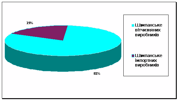 Аналіз споживчого ринку, проведений органами статистики на основі вибіркового обстеження магазинів різних форм власності регіональних центрів, Києва і Севастополя, показав, що асортимент вітчизняних виробників складає 81%, із-за кордону поставки шампанських вин становили 19%.
