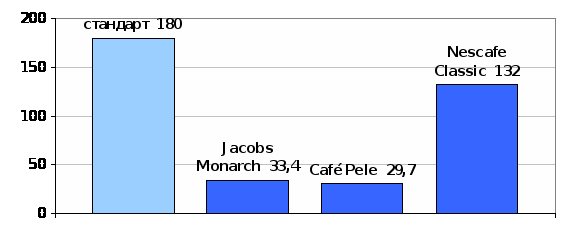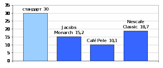 Аналізуючи дані таблиці можна зробити висновок, що найбільш високі показники якості за органолептичною оцінкою має кава „Jacobs Monarch”. Кава „Nescafe Classic” на другому місці, і найслабші показники має бразильська кава „Café Pele”.