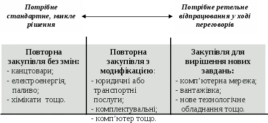 Найменшу кількість рішень приймає організація-споживач, що здійснює повторну закупівлю без змін, найбільшу – в ситуаціях закупівлі для вирішення нових завдань. В останньому випадку залучається велике коло фахівців, які відіграють ту чи іншу роль у процесі прийняття рішення про придбання.