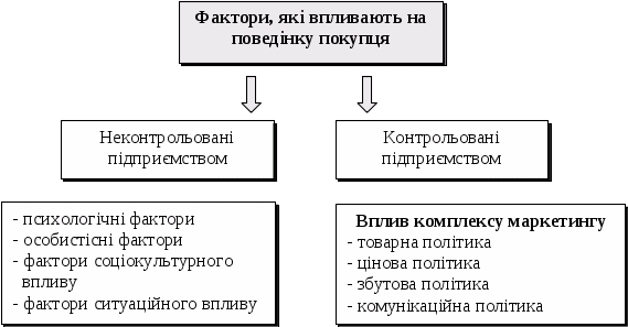 Загалом фактори, які впливають на купівельну поведінку покупця, можна поділити на дві групи: контрольовані та неконтрольовані з боку підприємства (рис.3).
