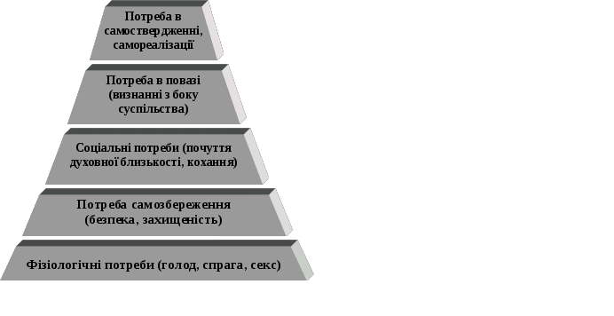 Значний внесок у теорію мотивації зробив американський учений А.Маслоу, який вважав, що людські потреби розміщені в ієрархічному порядку (рис.2).