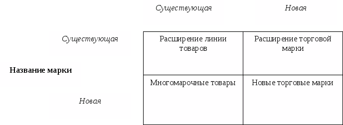 омпания должна выбрать себе общую марочную стратегию, которая будет не только влиять на все ее товары, но и определять направление развития марочных названий новых видов товара. Когда речь заходит о марочной стратегии, перед компанией возникает четыре возможности выбора (рис. 1).